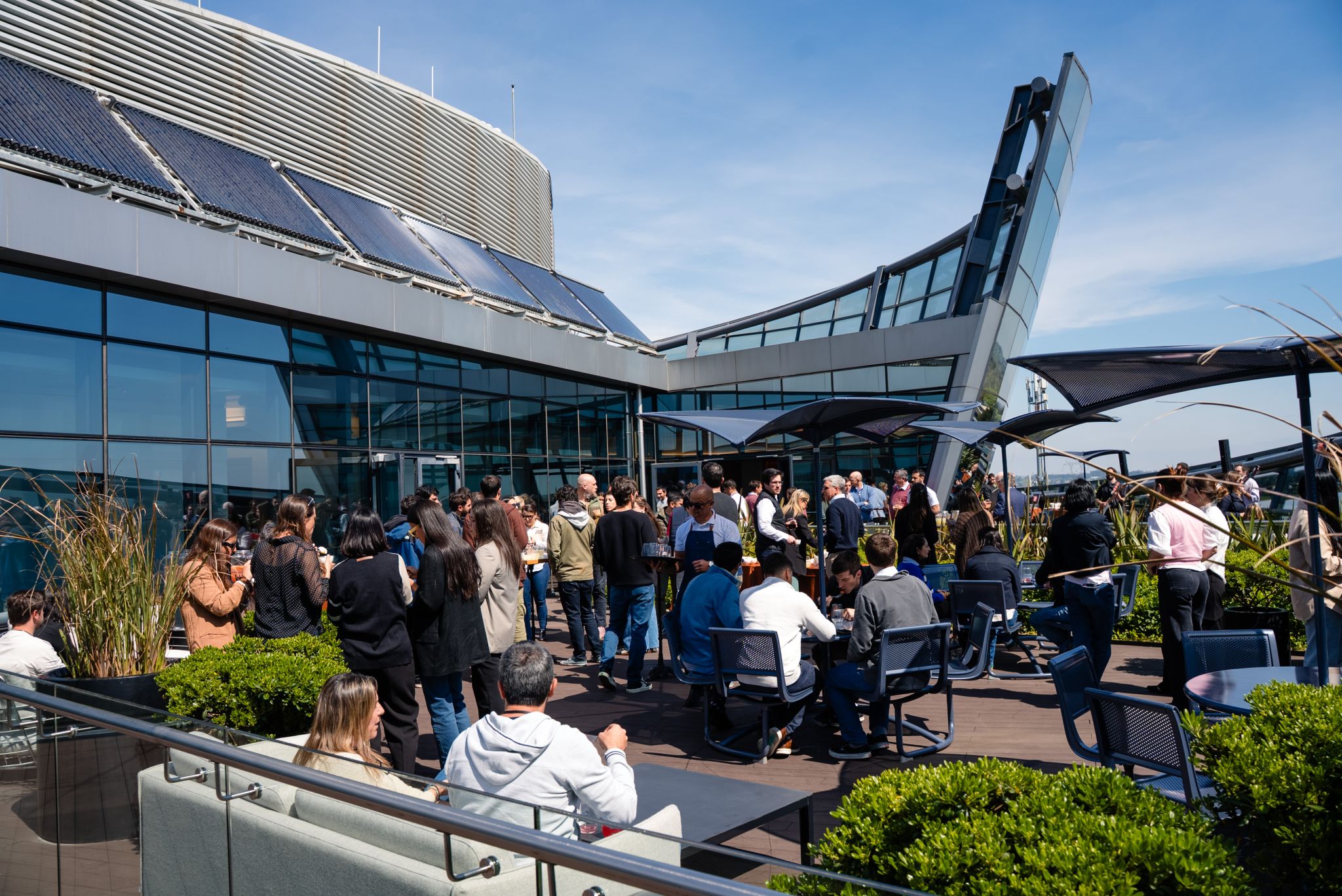 The Rooftop Lounge is now part of the Celebra building, adding a place designed to experience the workday in a different way.This new space invites you to have lunch, work, share moments, or take a break from the routine, in an environment that combines inspiration, connection, and well-being.The new lounge reflects our commitment to a campus in motion, constantly evolving to open new opportunities for experiences and connections within Zonamerica.